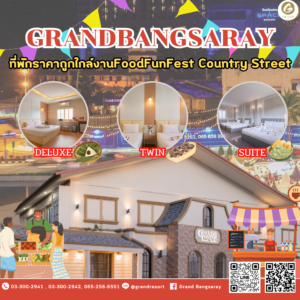 🎊🎉ท่านใดที่มาเดินเล่นที่งานเทศกาลอาหารพัทยาและมองหาที่พักใกล้งานเทศกาลอาหารพัทยา บรรยากาศเงียบสงบ ใช้เวลาในการเดินทางไม่นาน ขอแนะนำโรงแรม Grand Bangsaray ราคาเริ่ม 690 บาท